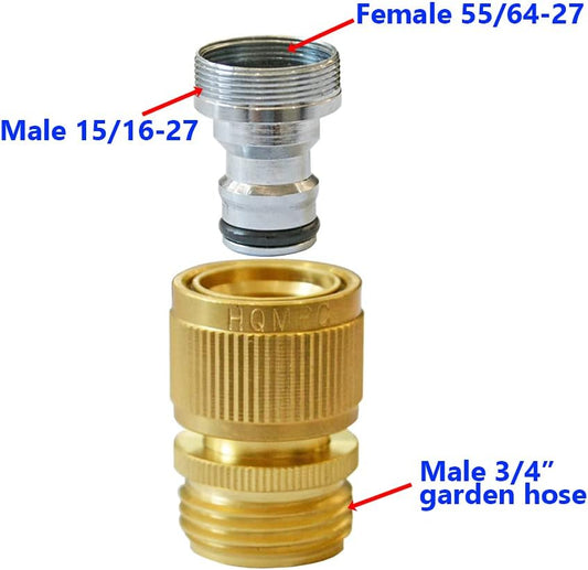 HQMPC Sink To Hose Faucet Adapter Faucet To Hose Adapter Kitchen Snap Adapter Washing Machine Quick Connect,Chrome Nipple Male 15/16-27 And Female 55/64-27 To Male 3/4" GHT Quick Coupler 2 Sets